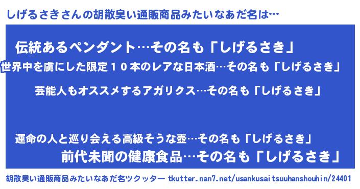 | 意味不明あだ名 | 『自称しげるさき』『永久保存しげるさき』 |