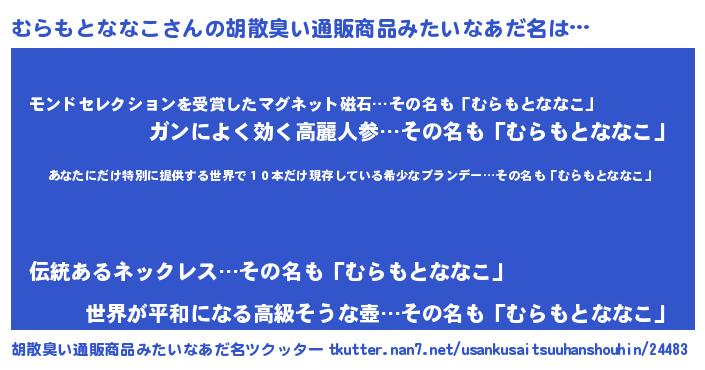 | 意味不明あだ名 | 『住所不定無職むらもとななこ(84歳)』 |