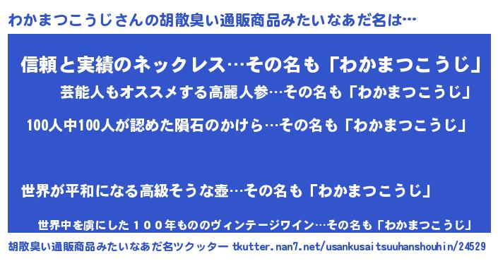 | 男性向けラノベタイトル風あだ名 | 『おまえをオタクにしてやるから、俺をわかまつこうじにしてくれ! 』 |