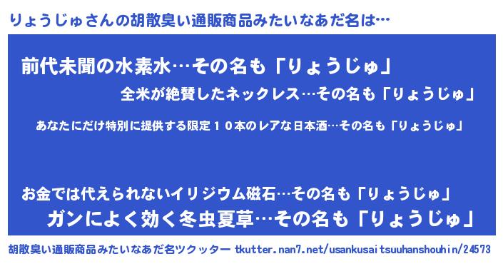 | 男性向けラノベタイトル風あだ名 | 『りょうじゅに滅ぼされるだけの簡単なお仕事です』 |