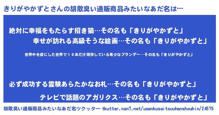 | ヘコむあだ名 | 『きりがやかずと(震え声)』『なまこ酢』 |
