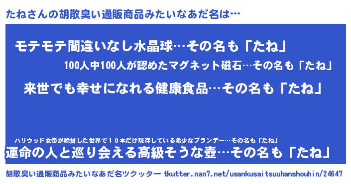 | 欧米人風あだ名 | 『ダルビッシュたね』『アンジェラ・たね』 |