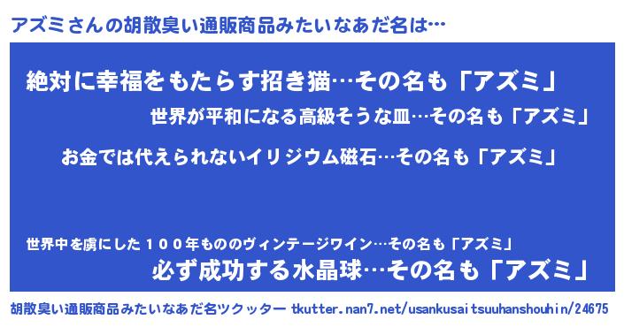 | ヘコむあだ名 | 『アズミ(爆)』『アズふぇ~』『牛乳』 |