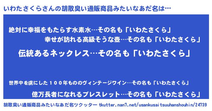| 男性向けラノベタイトル風あだ名 | 『転生したらいわたさくらだった件』 |
