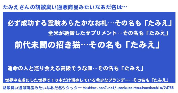 | ヘコむあだ名 | 『たみえ(小並感)』『たみっふぃ~』 |