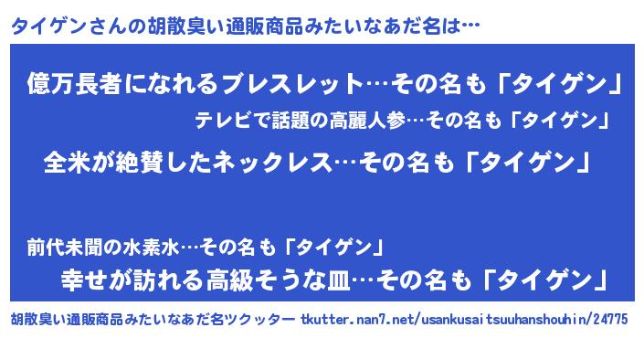 | 男性向けラノベタイトル風あだ名 | 『うちのタイゲンが世界を掌握している!』 |