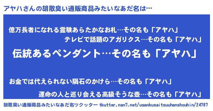 | 意味不明あだ名 | 『とにかく怪しいアヤハ』『自称アヤハ』 |