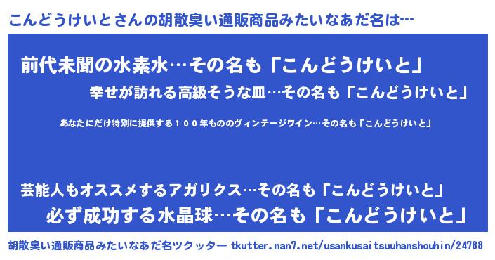 | 意味不明あだ名 | 『住所不定無職こんどうけいと(12歳)』 |