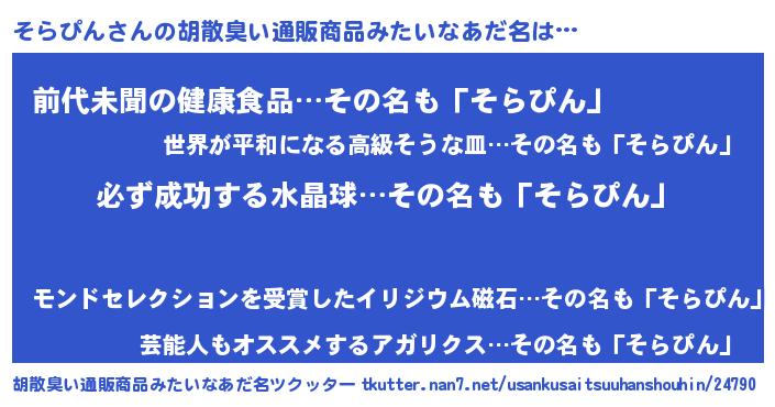 | 意味不明あだ名 | 『ペロリンそらぴん』『永久保存そらぴん』 |