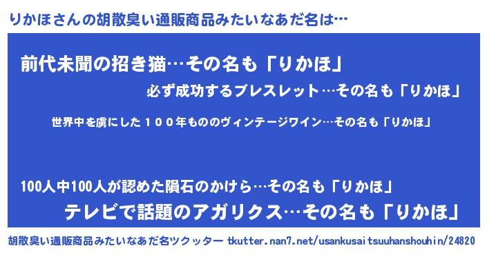 | 意味不明あだ名 | 『住所不定無職りかほ(1歳)』『自称りかほ』 |