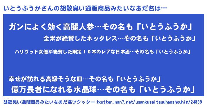 | 意味不明あだ名 | 『住所不定無職いとうふうか(39歳)』 |