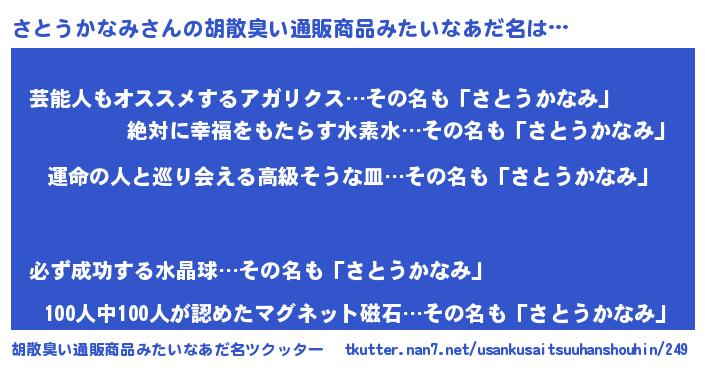 | 男性向けラノベタイトル風あだ名 | 『さとうかなみ~年齢イコール彼女いない歴の魔法使い~』 |