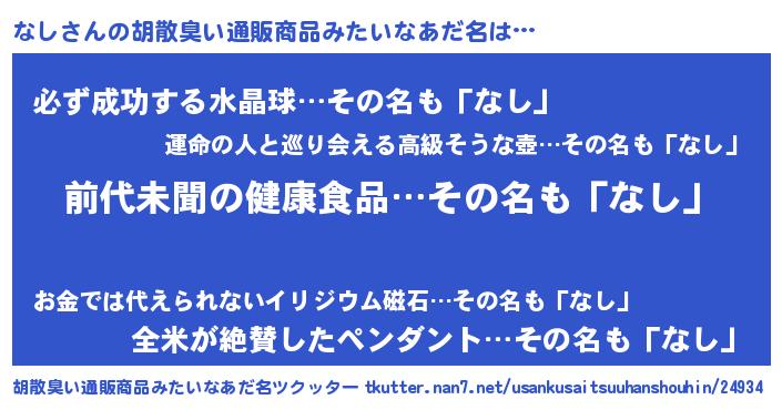 | 男性向けラノベタイトル風あだ名 | 『なしに滅ぼされるだけの簡単なお仕事です』 |