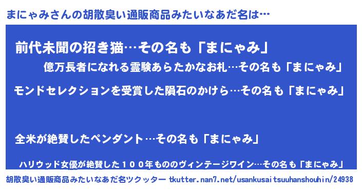 | ヒーロー風カッコイイあだ名 | 『慈愛の使者まにゃみ』『ネオマニャミ』 |