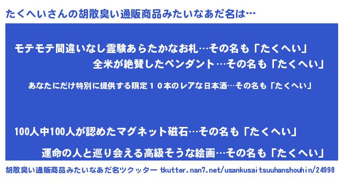 | 意味不明あだ名 | 『住所不定無職たくへい(56歳)』 |