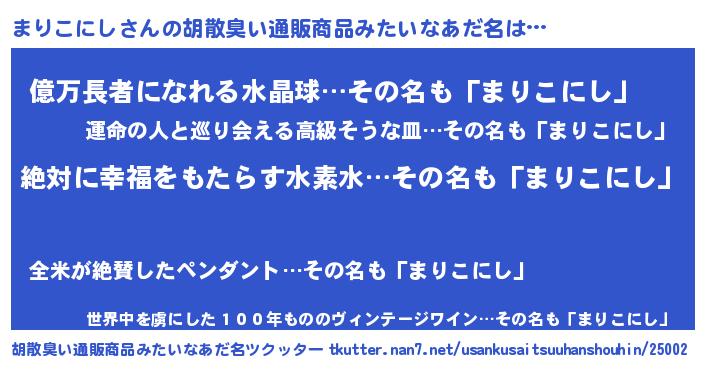| ヘコむあだ名 | 『まりこにし(苦笑)』『まりもー』 |