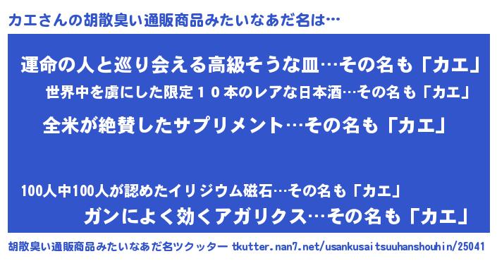 | 欧米人風あだ名 | 『アンジェラ・カエ』『ウサインカエ』 |