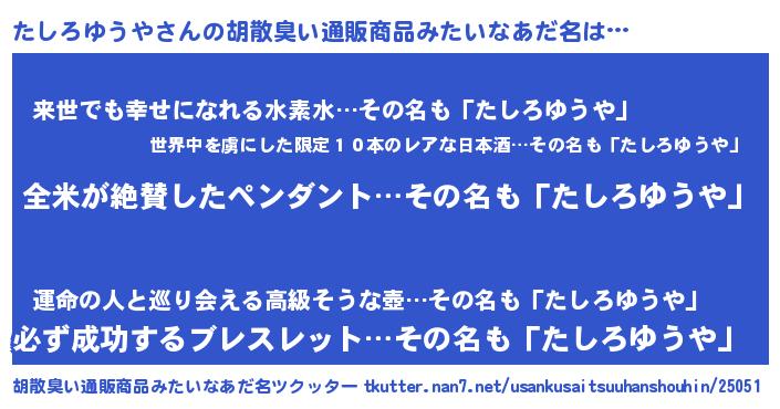 | ヘコむあだ名 | 『たしぷりん』『たしろゆうや(苦笑)』 |