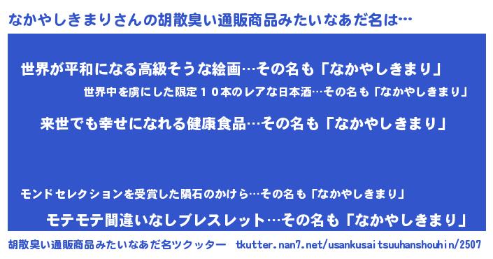 | ヘコむあだ名 | 『なかやしきまり(爆)』『なまこ酢』 |