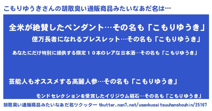 | 意味不明あだ名 | 『住所不定無職こもりゆうき(14歳)』 |