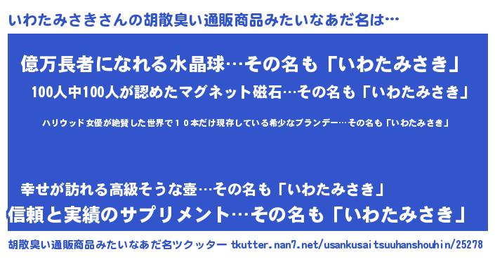 | 意味不明あだ名 | 『住所不定無職いわたみさき(74歳)』 |