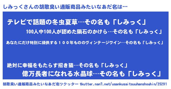 | 男性向けラノベタイトル風あだ名 | 『この素晴らしい世界にしみっくを!』 |