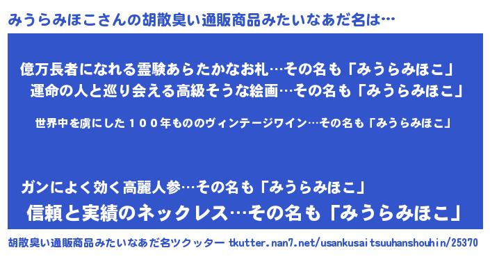 | 男性向けラノベタイトル風あだ名 | 『この素晴らしい世界にみうらみほこを!』 |