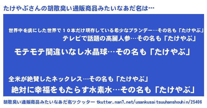 | 意味不明あだ名 | 『ペロリンたけやぶ』『永久保存たけやぶ』 |