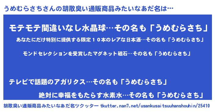 | 男性向けラノベタイトル風あだ名 | 『うめむらさち~年齢イコール彼女いない歴の魔法使い~』 |
