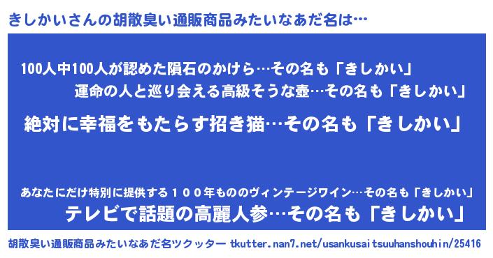 | 男性向けラノベタイトル風あだ名 | 『きしかいという概念が存在しない退屈な世界 』 |
