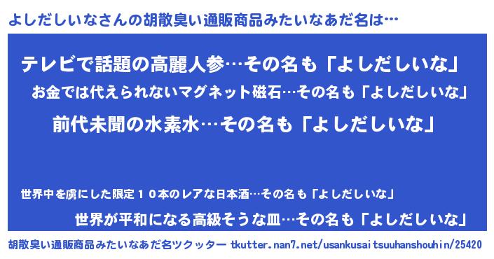 | 欧米人風あだ名 | 『ダルビッシュよしだしいな』 |