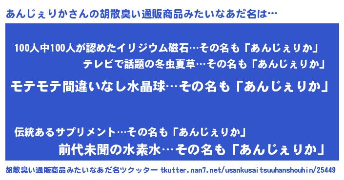 | 男性向けラノベタイトル風あだ名 | 『あんじぇりかの憂鬱』 |