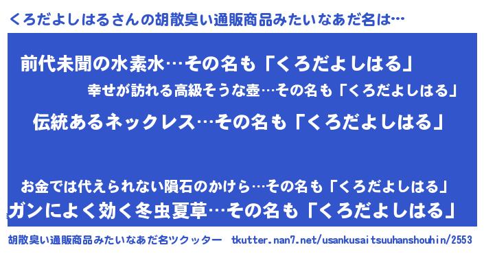 | 男性向けラノベタイトル風あだ名 | 『ダンジョンにくろだよしはるを求めるのは間違っているだろうか』 |