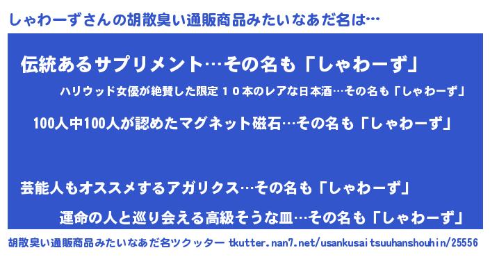 | 男性向けラノベタイトル風あだ名 | 『おまえをオタクにしてやるから、俺をしゃわーずにしてくれ! 』 |