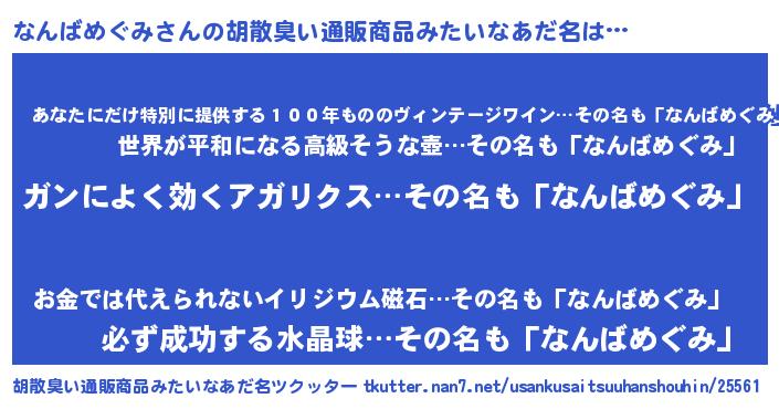 | 肩書あだ名 | 『なんばめぐみ総統』『なんばめぐみ教官』 |