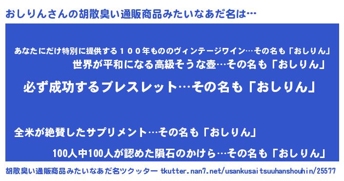 | 男性向けラノベタイトル風あだ名 | 『おしりんの憂鬱』『オシリンスレイヤー』 |