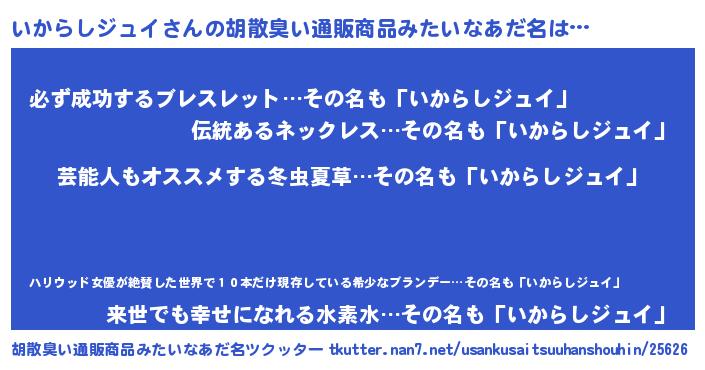 | 男性向けラノベタイトル風あだ名 | 『Re:いからしジュイから始める異世界生活』 |