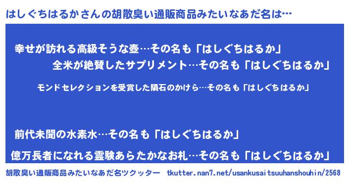 | 男性向けラノベタイトル風あだ名 | 『うちのはしぐちはるかが世界を掌握している!』 |