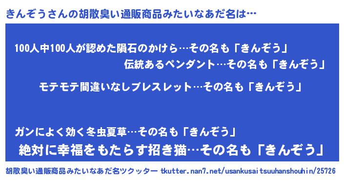 | 男性向けラノベタイトル風あだ名 | 『転生したらきんぞうだった件』 |
