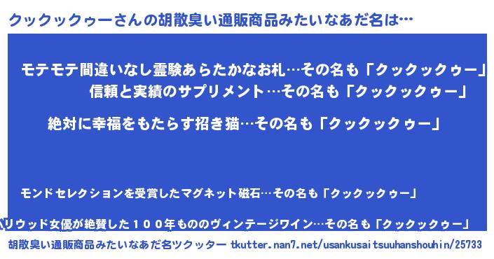 | ヘコむあだ名 | 『クックックゥー(笑)』『クッふぇ~』 |