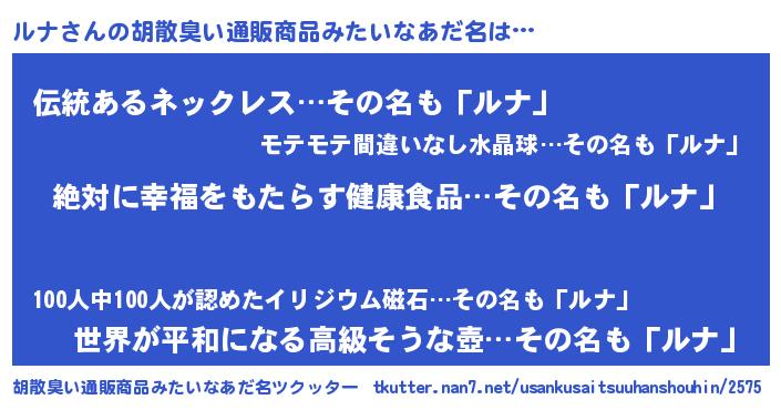 | 女子向けラノベタイトル風あだ名 | 『異世界で失敗しない100のルナ』 |