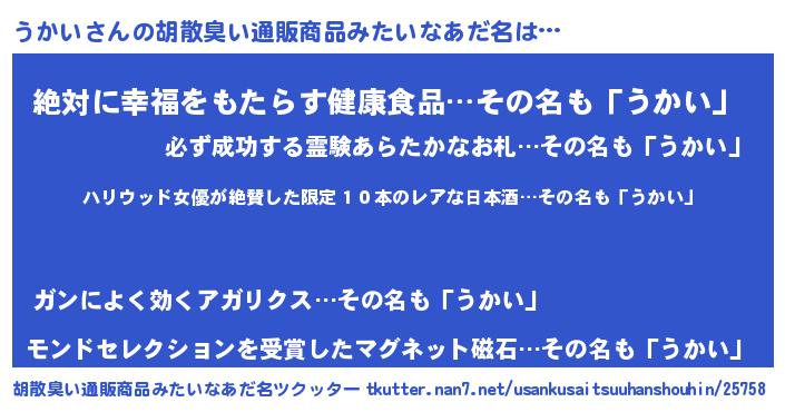 | ヘコむあだ名 | 『うかい(笑)』『うかもー』 |