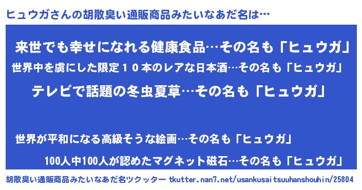 | 男性向けラノベタイトル風あだ名 | 『Re:ヒュウガから始める異世界生活』 |