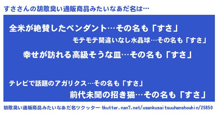 | 女子向けラノベタイトル風あだ名 | 『すさの雑貨屋さん』『すさ様がみてる』 |