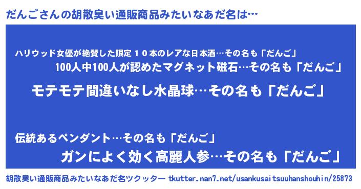 | 男性向けラノベタイトル風あだ名 | 『だんごの憂鬱』『魔弾の王とだんご』 |