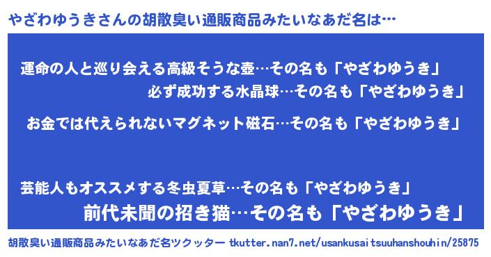 | ヘコむあだ名 | 『なまこ酢』『やざわゆうき(苦笑)』 |