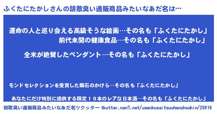 | 男性向けラノベタイトル風あだ名 | 『ふくたにたかしの嫁は女の子じゃないと思った?』 |