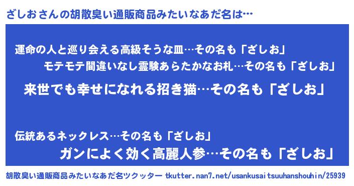 | 男性向けラノベタイトル風あだ名 | 『転生したらざしおだった件』 |