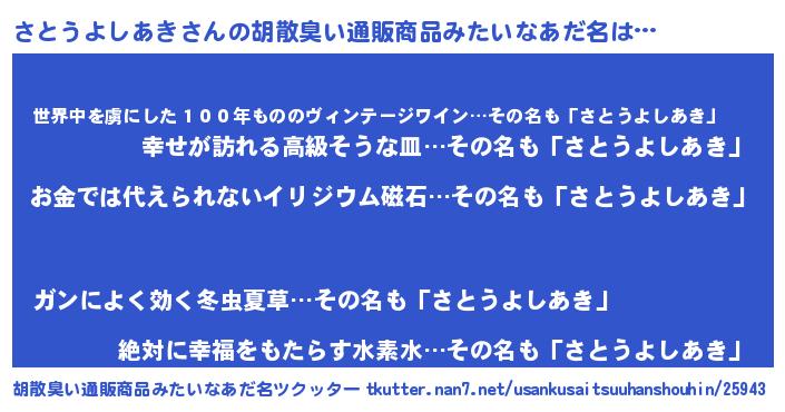 | ヘコむあだ名 | 『さとうよしあき(笑)』『豆乳』 |
