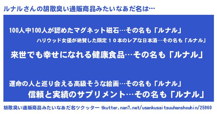 | ヘコむあだ名 | 『ルナル(笑)』『ルナ太郎』『牛乳』 |